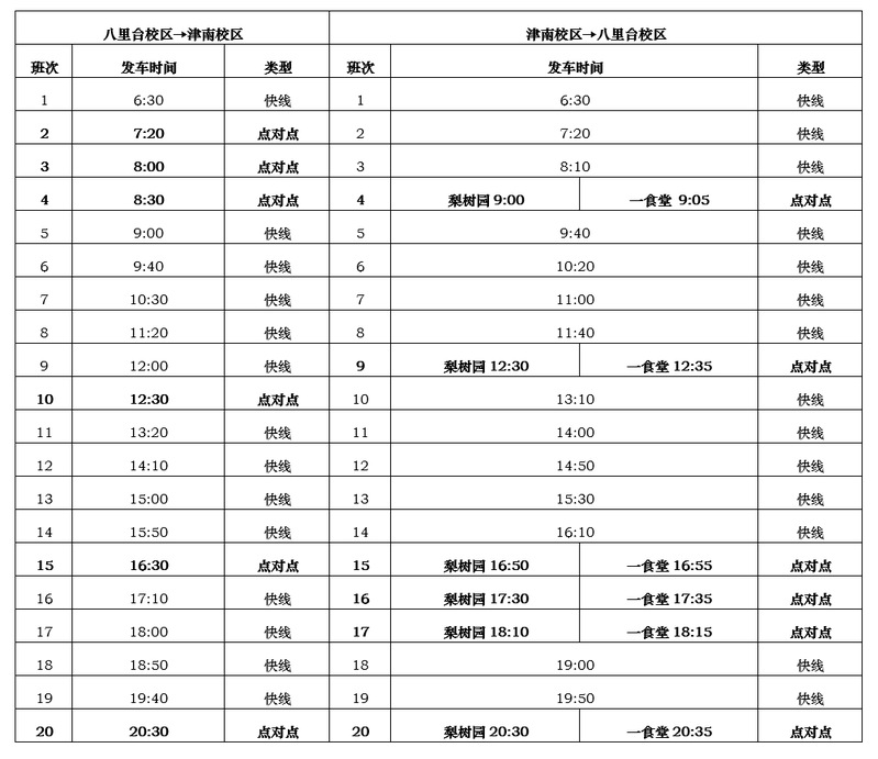 泰达与八里台、津南校区通勤班车7月6日至9月2日实行暑假运行方案,9月3日(星期五)恢复工作日运行,9月4日、5日按照公休日运行。具体安排如下: