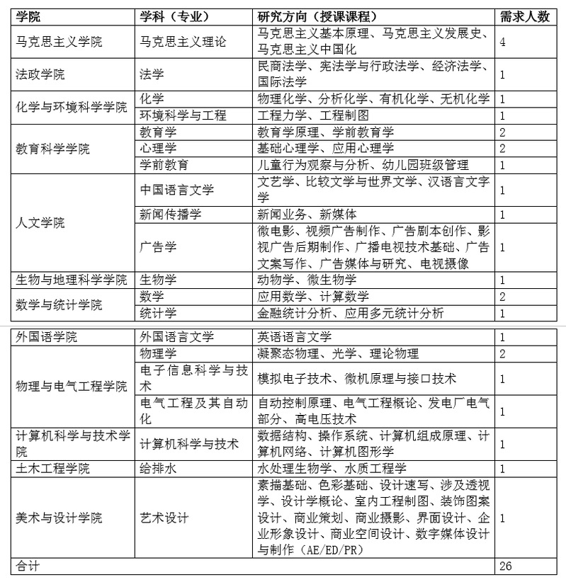 学校现有16个教学单位,55个本科专业(含4个专业方向):其中,师范类专业23个,非师范类专业32个,涵盖理学、工学、文学、教育学、艺术学、法学、经济学、管理学、历史学九个学科门类。有4个一级学科硕士学位授权点,3个硕士专业学位授权点。拥有高台和新泉2个校区,占地面积166.07万平方米,教学设施设备先进,教学环境舒适。图书馆藏书131.55万册,电子图书约60万册,各类文献数据库12个;校园网及5G通信网络覆盖全校,拥有完善的较高标准的教学实验设备和文化、体育、卫生等设施。