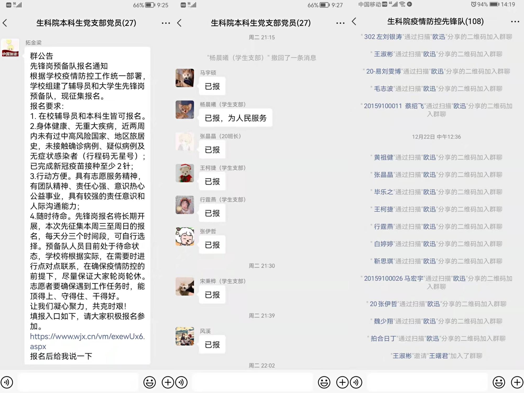 在疫情阻击战中,生科院各党支部积极响应学院党委号召,第一时间向学院全体学生进行招募并组建生科院疫情防控先锋队,在短短1小时左右的招募中,100余名同学踊跃报名加入。同学们在做好个人防护的基础上,纷纷通过各自力所能及的方式,积极投身到疫情防控中,用实际行动彰显新时代大学生的风采和本色。