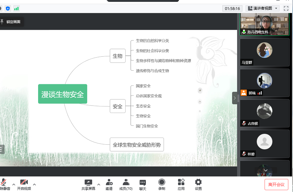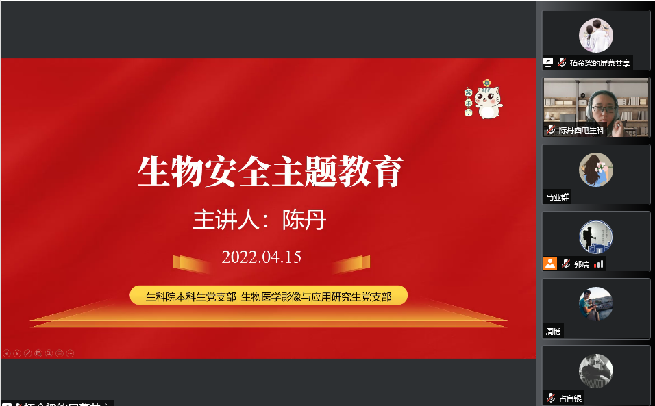 其次,为深入学习贯彻落实习近平总书记“把生物安全纳入国家安全体系”重要论述,让同学们更直观地理解生物安全相关知识,培养同学们对专业的兴趣,4月15日下午,生命科学技术学院本科生党支部联合生物医学影像与应用研究生党支部举办生物安全教育主题线上讲座,我院陈丹老师担任主讲嘉宾,会议由辅导员郭瑞主持,共计70余人线上参会。